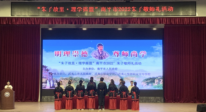 为了弘扬尊师重教的传统美德,丰富朱子职业教育思想文化。2022年9月14日下午三点,我校在报告厅隆重举行 “朱子故里·理学摇篮”2022朱子敬师礼活动,本次活动由武夷金年会体育业学院和武夷山旅游职业中专学校联合举办。校领导李海波、李立泉、罗莹、游秀英,武夷山旅游职业中专学校副校长吴芳芳、工会主席吴雪丽等领导出席了本次朱子敬师礼活动。