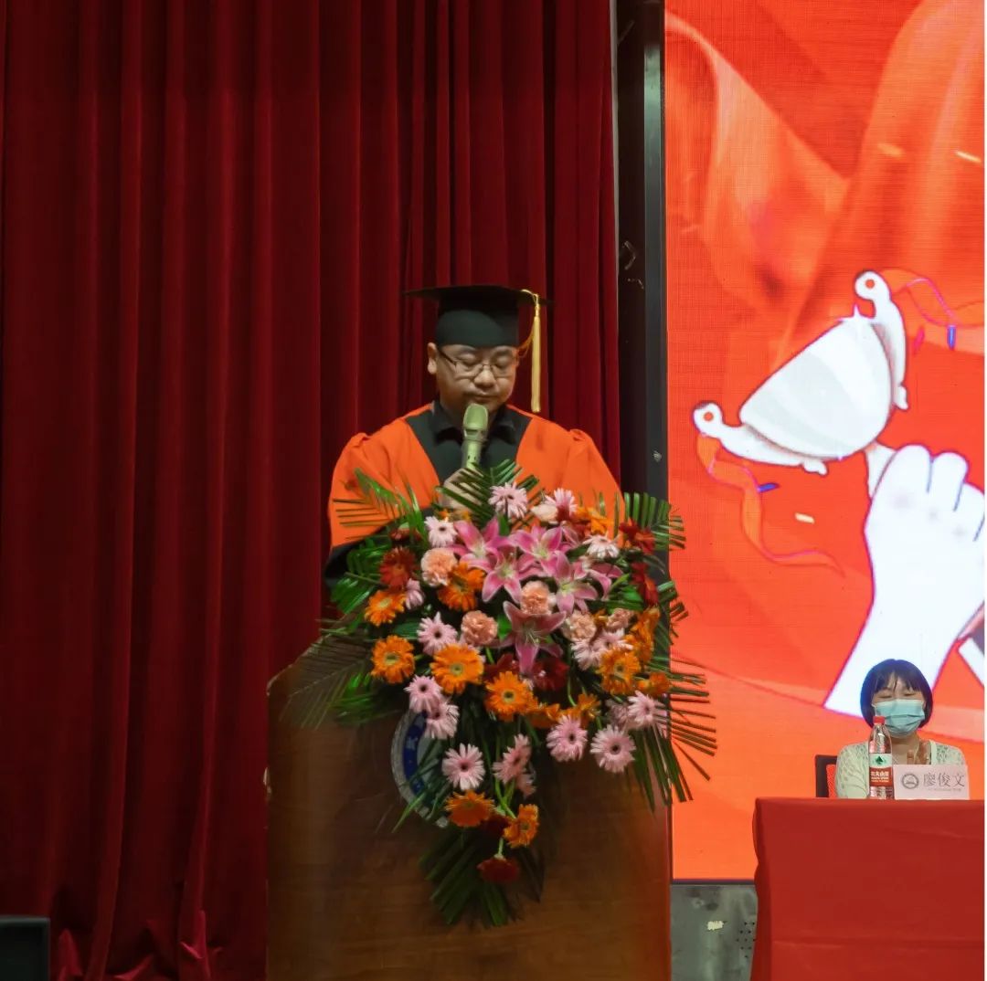 执行校长李海波代表学校向2022届毕业生圆满完成学业,开启人生新征程表示祝贺,向助力学生成长成才的家长和老师致以敬意和谢意。并对毕业生提出三点希望:一是要保持终身学习的理念,相信自己的学问。把学问做进生活,让生命走进学问,在活生生的考验中判别冷暖、增进智慧,毕业不是人生学习的休止符。二是要秉持一种精神。精神之所以伟大,因为他比任何思想都坚不可摧,它让我们在顺境时清醒,逆境时不放弃,身居高位而谦卑,出入平凡而尊贵。三是要拥有一颗感恩的心,感恩,从不遗忘开始。感恩的根源是爱,是对这个世界的善意。愿大家带着这份善意,以乐观积极感染人,以真诚热情善待人。
